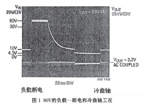 “冷曲軸”(cold crank)段,發(fā)生在汽車發(fā)動機(jī)經(jīng)受冷卻或凝固期間,發(fā)動機(jī)油變的非常粘滯。因而要求起動機(jī)輸出更大的轉(zhuǎn)矩,相繼需要蓄電池提供更大的電流。這一大的電流負(fù)載導(dǎo)致蓄電池/一次母線的電壓降低,甚至低于4V的點(diǎn)火電壓。隨后,又回復(fù)至額定電壓13.8V(圖1)。這在某些應(yīng)用場合,例如發(fā)動電機(jī)控制、安全系統(tǒng)和導(dǎo)航系統(tǒng)均不可避免。故要求具有良好調(diào)節(jié)的輸出電壓(一般為3.3V)貫穿“冷曲軸”段,以實(shí)現(xiàn)全過程的無間斷(連續(xù))運(yùn)行。