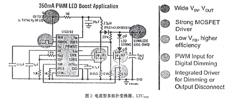 裝有LTC3783 LED驅(qū)動器在汽車上應(yīng)用時,具有以下很重要的特點(diǎn):(1)大電流、為輸出大的電流(≥1.5A),LTC3783驅(qū)動外部的N溝道MOSFET,可給高亮度(HB)和超高亮度(SHB) LED供電;(2)高電壓、LTC3783 3V~36V的輸入運(yùn)作和輸出電壓,取決于外部功率元件的選擇,這可按標(biāo)準(zhǔn)確定,易于驅(qū)動LED燈串或混串(串+并);(3)保護(hù)。對HB LED的保護(hù),需要IC結(jié)合精確的電流和輸出電壓調(diào)節(jié)。附加保護(hù)包括過電壓、過電流和軟啟動;(4)調(diào)光、以純色PWM3000∶1數(shù)字式調(diào)光時,在寬廣的調(diào)光比下保持LED恒定的顏色。而且,LTC3783還能附加模擬100∶1的調(diào)光。