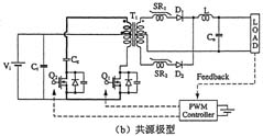 伴隨著開關(guān)電源開關(guān)操作時急劇的電壓和電流變化而產(chǎn)生的浪涌和噪聲將作為傳導(dǎo)噪聲或輻射噪聲傳遞至設(shè)備的外部,從而引發(fā)電磁干擾(EMI)問題。傳導(dǎo)噪聲(特別是共模噪聲)中也時常會產(chǎn)生很大的環(huán)路電流,這是輻射噪聲的起因。近幾年來,ZVS(零電壓開關(guān))和ZCS(零電流開關(guān))等軟開關(guān)(SoftSwitching)技術(shù)作為抑制浪涌發(fā)生的常規(guī)方法已經(jīng)廣為人知。不過,人們在此基礎(chǔ)上又提出了多種能夠兼顧低功耗和低噪聲目標(biāo)的電路方案。圖5(a)示出了采用有源鉗位電路的傳統(tǒng)型轉(zhuǎn)換器電路。鉗位開關(guān)Q2需要在高壓側(cè)進(jìn)行絕緣驅(qū)動,這里通常采用的是脈沖變壓器。然而,如圖5(b)所示,研究人員最近又提出了一種共源極型有源鉗位電路方案,它將兩個MOSFET開關(guān)的源極端子共接,從而簡化了柵極驅(qū)動。不僅如此,這種共源極型電路方式還有望降低噪聲,經(jīng)實驗測量,其噪聲電平較之傳統(tǒng)型電路下降了約30dB。