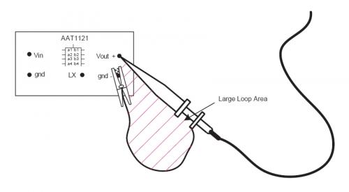 下圖是一個錯誤的測量方式,因為示波器的地線會拾取輻射噪聲。示波器的地線和信號探頭形成的環(huán)路形成了一個天線。環(huán)路面積越大,在電源PWM切換時,示波器接受到的開關(guān)噪聲就越大。