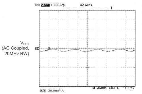 下圖是采用20MHz帶寬限制測試到的電源的紋波以及噪聲。示波器20MHz的帶寬限制是為了防止無源探頭帶入的共模噪聲??梢钥吹紸AT1121BUCK轉(zhuǎn)換器的紋波噪聲為10mVp-p,幾乎看不到開關(guān)噪聲。這主要是歸功于BUCK控制器的低噪聲設(shè)計,良好的PCB設(shè)計,以及恰當(dāng)?shù)臏y試方法。