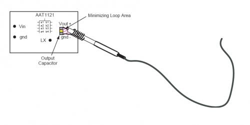 在測量中,如何減小拾取的輻射噪聲?最簡單可靠的方法是采用一個接地環(huán)來測量電源紋波以及噪聲。為了進一步的降低測試誤差,可以將示波器探頭和地線直接放在電源輸出電容得兩端。如下圖所示,采用這種方法,在信號探頭和地線之間的環(huán)路面積很小,所以測量中帶來誤差的噪聲幾乎可以忽略。