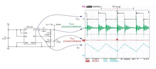下圖描述了采用兩個不同的測試方法得到的Vout波形。電源電路是一個BUCK轉(zhuǎn)換電路(AAT1121),工作在1.5MHz的開關(guān)頻率,輸出電壓為1.8V/250mA。示波器采用全帶寬測試。可以看到伴隨著PWM開關(guān),在綠色的trace2有一個很高的噪音以及振鈴,但是trace3上卻沒有明顯的噪聲。通過對比可以看到,測試方法的選擇對結(jié)果的準(zhǔn)確性很關(guān)鍵。