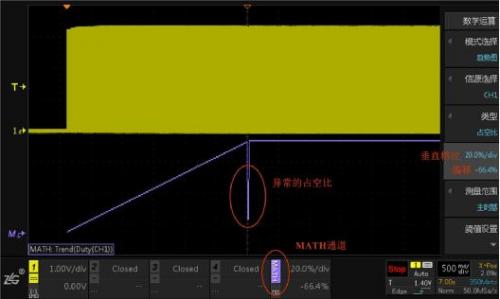 這個(gè)時(shí)候用ZDS4000系列示波器新開發(fā)獨(dú)特的占空比趨勢(shì)測(cè)量功能,將每一個(gè)PWM波的占空比顯示在屏幕上,點(diǎn)擊示波器數(shù)學(xué)運(yùn)算Math按鍵,模式選擇趨勢(shì)圖,類型選擇占空比,示波器會(huì)自動(dòng)檢測(cè)PWM波的周期和閾值,無需過多設(shè)置,就可以快速出波形,波形如圖5所示。屏幕上除了通道1,還多了MATH通道,顏色為紫色,MATH通道顯示的即是占空比趨勢(shì),可以看到占空比緩慢遞增后大約在屏幕中間位置出現(xiàn)了異常。和通道1一樣,MATH通道也可以調(diào)節(jié)垂直檔位和偏移。