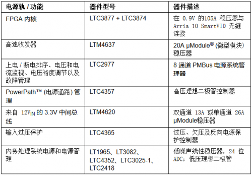 表 1 概述了圖 1 所示 Arria 10 開發(fā)套件電路板的電源軌和功能。該表列出了凌力爾特公司的器件,并描述了每種器件的功能。訪問 www.linear.com.cn/altera,點擊 Arria,了解本文所示兩種電路板的詳細技術信息。