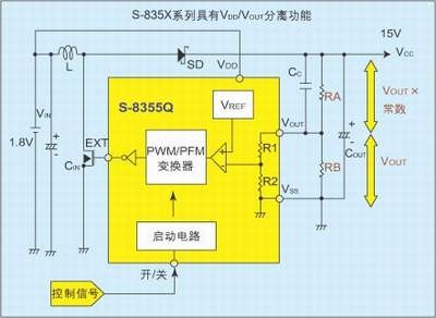 圖2是產(chǎn)生LCD用正電壓和負(fù)電壓的應(yīng)用電路,它用一個(gè)升壓DC/DC變換器來(lái)產(chǎn)生正負(fù)電壓。電路中使用了VDD/VOUT分離型器件S-8356Q50,在Vout端子接口,通過(guò)使用電阻對(duì)輸出電壓進(jìn)行分壓,這樣可以調(diào)整輸出電壓。通過(guò)R1和R2正電壓可以達(dá)到很高,負(fù)電壓可以通過(guò)C1、SD3、SD2使正電壓反轉(zhuǎn)為負(fù)電壓。
