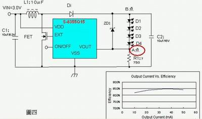 圖3所示的電路是白光LED用電源。由于白光LED是電流控制,因此需要穩(wěn)定的電流。此電路中,流過(guò)LED的是穩(wěn)定電流。為控制各LED亮度偏差,LED采用串聯(lián)的方式排列。DC/DC變換器采用了S-8356Q15 VDD端子與VOUT端子分離型,輸出電壓為1.5V。