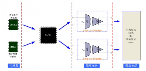 如圖 3所示,MCU處理數(shù)字溫度、濕度傳感器的信號(hào),處理完畢后,通過信號(hào)調(diào)理模塊隔離,再傳送出去,以便跟現(xiàn)場(chǎng)的電流輸入,或電壓輸入型電力儀表相連,同時(shí)具備隔離的功能,防止傳感器前端的干擾信號(hào)串入現(xiàn)場(chǎng)的電力儀表、PLC,DCS等。