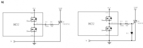 圖3b是圖3a示意圖的衍生圖,用于控制ACS開(kāi)關(guān)的特殊情況(像本例中的ACS108一樣)。因?yàn)锳CS開(kāi)關(guān)在COM和G端子之間有一個(gè)P-N結(jié),禁止任何拉電流從G流向COM,二極管D1是微控制器I/O引腳置高電平時(shí)用于給電容C1充電。
