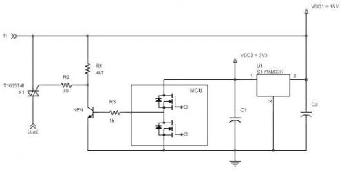 基于這些原因,圖2的電路示意圖整合了負(fù)電源和正穩(wěn)壓器的雙重優(yōu)點(diǎn)。在這個(gè)示意圖中,ST715M33R是最大靜態(tài)電流5.5 µA的正穩(wěn)壓器,與“負(fù)”15V輸出相連,為微控制器提供3.3V電源電壓,其中,-15V電壓是基于VIPer06的降壓升壓轉(zhuǎn)換器或反激式轉(zhuǎn)換器的輸出 (參見(jiàn)意法半導(dǎo)體的AN4564應(yīng)用筆記)。T1635T-8是一個(gè)T系列三象限雙向可控硅,微控制器能夠吸收T1635T-8的電流。