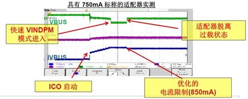 其次,能夠?qū)崿F(xiàn)97%的效率得益于TI獨(dú)特的ICO算法,ICO能夠?qū)崟r(shí)檢測(cè)適配器的電流能力大小。文司華博士做了詳細(xì)解釋,“如上圖所示,這是我們的VBus,當(dāng)接入電池后發(fā)生了一些變化。接入電池后就開始充電了,作為ICO模式,作為比較小的電流去測(cè),比如500毫安開始啟動(dòng)了,在500毫安時(shí)適配器很舒服地進(jìn)行工作,當(dāng)電流逐漸上調(diào)了以后,我們會(huì)發(fā)現(xiàn)Bus電壓突然掉下來(lái)了,它能掉下來(lái)并且保持在這個(gè)模式下,VEDPM模式啟動(dòng)了,在這個(gè)模式里,適配器實(shí)際上已經(jīng)過(guò)載了,由于VEDPM功能的保護(hù),適配器雖然過(guò)載但還能工作,因此這個(gè)點(diǎn)能夠保持,但這不是最理想的狀況,原因是它讓適配器過(guò)載了,適配器會(huì)發(fā)燙的,最好的處理辦法是讓適配器能夠脫離這個(gè)狀態(tài),ICO功能能夠讓電流再退回一點(diǎn),等它退回一點(diǎn),這個(gè)適配器就脫離過(guò)載狀態(tài)了。”