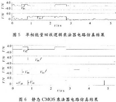 從圖中可見,用靜態(tài)CMOS電路構(gòu)成的乘法器輸出比較穩(wěn)定,輸出等于0或VDD,功率消耗為1.51×10-7W。而用單相能量回收電路構(gòu)成的二位乘法器的輸出不夠穩(wěn)定,對(duì)噪聲信號(hào)較為敏感,但是并不影響輸出邏輯,功率消耗減小為1.17×10-7W。從節(jié)能的角度來看,單相能量回收電路性能更好。