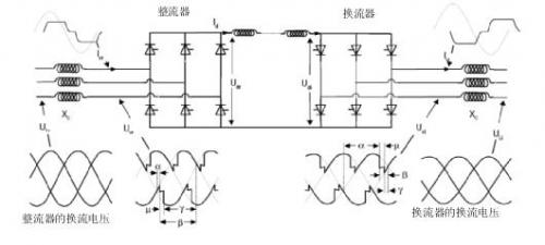 由于晶閘管只能接通,不能斷開,因此交流電壓會使晶閘管發(fā)生反向偏置并停止傳導。因此,LCC中的晶閘管的偏置取決于電網AC側用于換流的功率。在晶閘管正向偏置后導通時的延時決定了相位角延遲(觸發(fā)角)。晶閘管的相位角延遲實現(xiàn)了交流波的相位角控制。