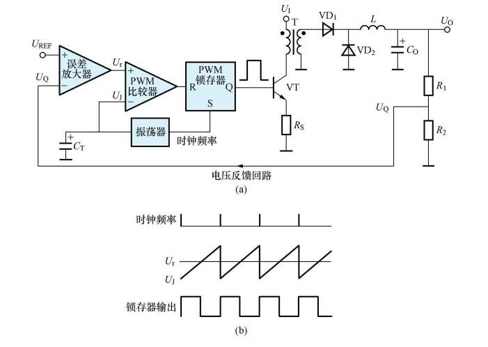 電壓控制是開關(guān)電源最常用的一種控制類型。以降壓式開關(guān)穩(wěn)壓器(即Buck變換器)為例,電壓控制型的基本原理及工作波形分別如圖1 (a)、(b)所示。其特點(diǎn)是首先通過對輸出電壓進(jìn)行取樣(必要時(shí)還可增加取樣電阻分壓器),所得到的取樣中壓UQ就作為控制環(huán)路的輸入信號。然后對取樣電壓和基準(zhǔn)電壓UREF進(jìn)行比較,并將比較結(jié)果放大成誤差電壓Ur,再將Ur送至PWM比較器與鋸齒波電壓Uj進(jìn)行比較,獲得脈沖寬度與誤差電壓成正比的調(diào)制信號。圖1 (a)中的振蕩器有兩路輸出,一路輸出為時(shí)鐘信號(方波或矩形波),另一路為鋸齒波信號, CT為振蕩電容。T為高頻變壓器,VT為功率開關(guān)管。降壓式輸出電路由整流二極管VD1、續(xù)流二極管VD2、儲能電感L和濾波電容Co組成。PWM鎖存器的R為復(fù)位端,S為置位端。