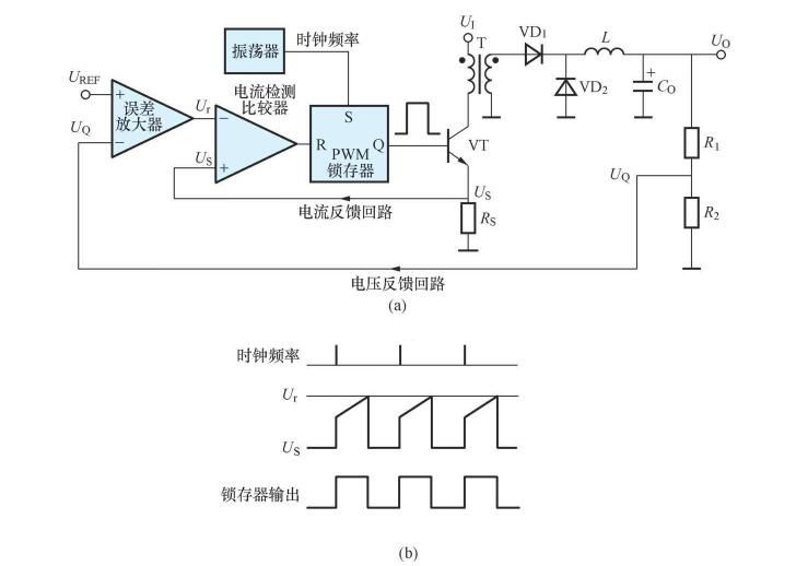 電流控制型是在電壓控制環(huán)的基礎(chǔ)上又增加了電流控制環(huán),其基本原理及工作波形分別如圖2 (a)、(b)所示。Us為電流檢測電阻的壓降,此時(shí)PWM比較器變?yōu)殡娏鳈z測比較器。電流控制型需通過檢測電阻來檢測電流,并且可逐個(gè)周期的限制電流,便于實(shí)現(xiàn)過電流保護(hù)。固定頻率的時(shí)鐘脈沖將RS鎖存器置位,從Q端輸出的驅(qū)動信號為髙電平,使功率開關(guān)管VT導(dǎo)通,髙頻變壓器一次側(cè)的電流線性地增大。當(dāng)電流檢測電阻Rs上的壓降達(dá)到并超過Ur時(shí),電流檢測比較器翻轉(zhuǎn),輸出的高電平將鎖存器復(fù)位,從Q端輸出的驅(qū)動信號變?yōu)榈碗娖?,令幵關(guān)管關(guān)斷,直到下一個(gè)時(shí)鐘脈沖使RS鎖存器置位。