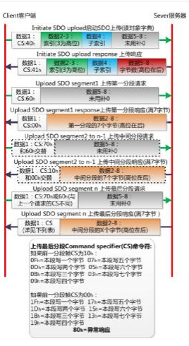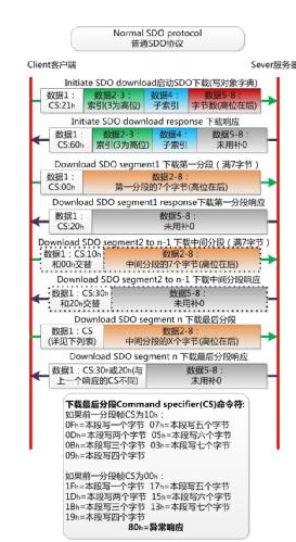 成熟的應(yīng)用層協(xié)議都有可靠的分幀協(xié)議,比如CANopen,DeviceNET,J1939協(xié)議等,總的方針都是“握手”“傳輸”“確認(rèn)”“結(jié)束”這四個(gè)過程循環(huán)。這里只介紹CANopen協(xié)議中的SDO多幀傳輸。