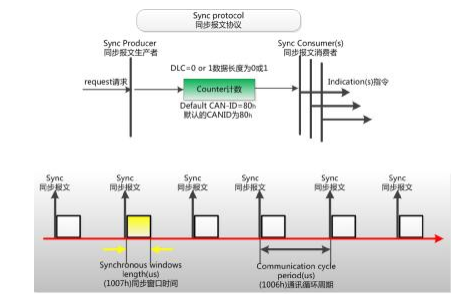 一般同步報(bào)文由NMT(網(wǎng)絡(luò)管理)主機(jī)發(fā)出,CAN報(bào)文的數(shù)據(jù)為0字節(jié)。但如果一個(gè)網(wǎng)絡(luò)內(nèi)有2個(gè)同步機(jī)制,就需要設(shè)置不同的同步節(jié)拍,比如某些節(jié)點(diǎn)按1個(gè)同步幀發(fā)送1次PDO,其他的節(jié)點(diǎn)收到2個(gè)同步幀才發(fā)送1此PDO,