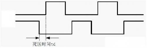 對于半橋、全橋和LLC諧振等一些H橋或半H橋的拓撲電源,PWM的死區(qū)時間設定對電源可靠性至關重要。實際上設定死區(qū)時間實則為了避免上、下管直通從而導致電源炸機,也就是說設定一段上、下管同時關斷的時間,在上管關斷后延遲一段時間再導通下管或在下管關斷后延遲一段時間再導通上管,如圖5所示td即為死區(qū)時間。