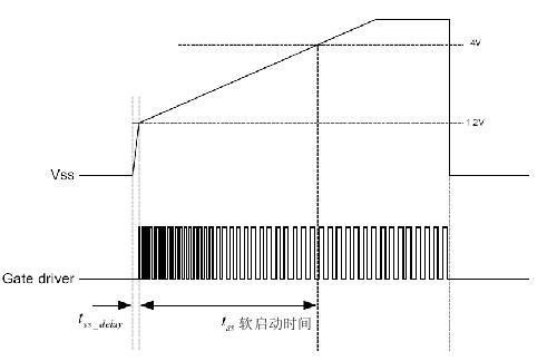 電源的軟啟動對降低場效應管和輸出二極管的尖峰電壓和尖峰電流有很大幫助,從而降低了其電壓應力和電流應力。但是對于LLC諧振電源來說,軟啟動對電源起機的可靠性非常關鍵;因為LLC電源的IC是通過高頻掃描的方式啟動的。如圖6所示在IC啟動時驅動PWM頻率會從設定的最高頻率開始慢慢恢復正常頻率,恢復時間也就是軟啟動時間。在此期間電源工作在不穩(wěn)定狀態(tài),軟啟動時間越長,啟動越安全;但軟啟動時間過長也會對電源帶容性負載能力和起機時間造成影響。